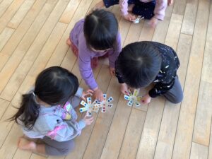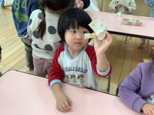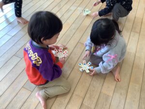 自分で好きな色のシールを選んで貼った後に、みんなで一緒に回してみました!