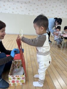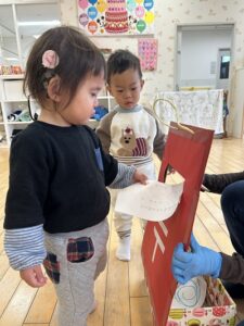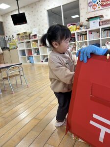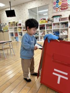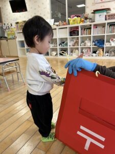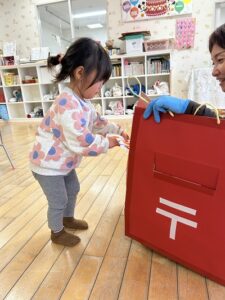 『やぎさんゆうびん』の歌をテーマに郵便遊びをしました。自分で書いた手紙をポストにポトンッ😊 上手に入れていましたよ🎵