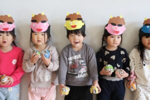 ビックリして涙が出てしまう子もいましたが、勇気を出して、「鬼は外!」と豆代わりのボールを投げて鬼退治をしてくれました👹😊😊